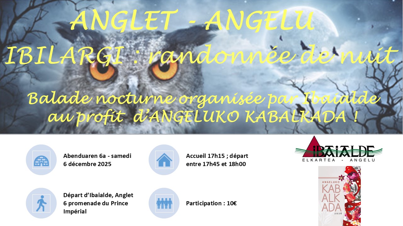 Depuis 2015, Ibaialde organise la randonnée IBILARGI. C’est une petite randonnée d’une dizaine de KM qui nous permet de fêter le solstice d’hiver et bien sur Olentzero ! Elle se déroule à la tombée de la nuit afin de sensibiliser les personnes au fait que près d’1,5 milliard de personnes n’ont pas accès à l’énergie électrique !